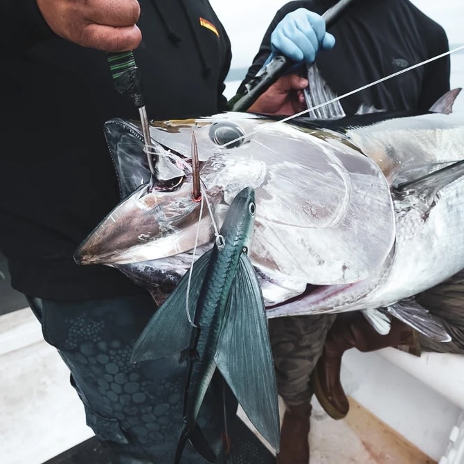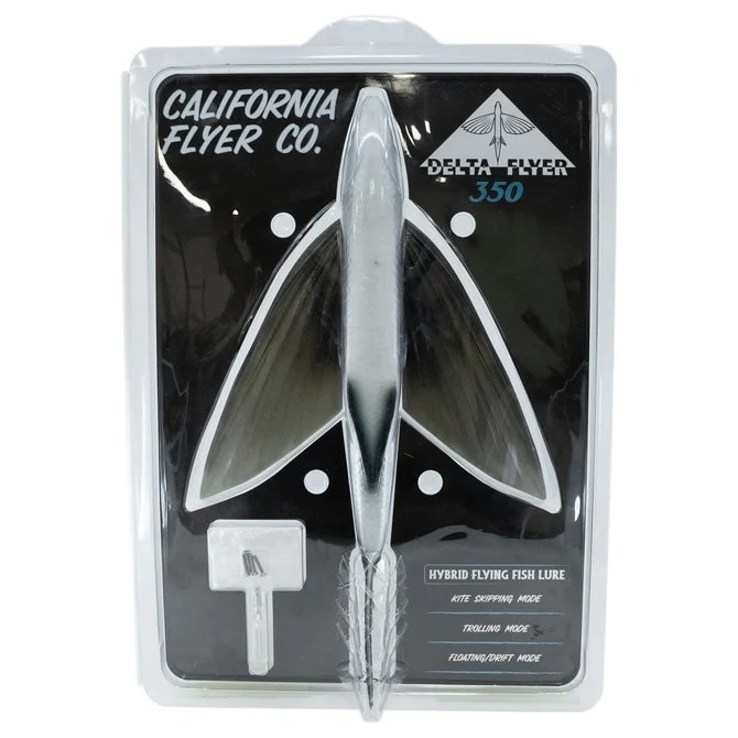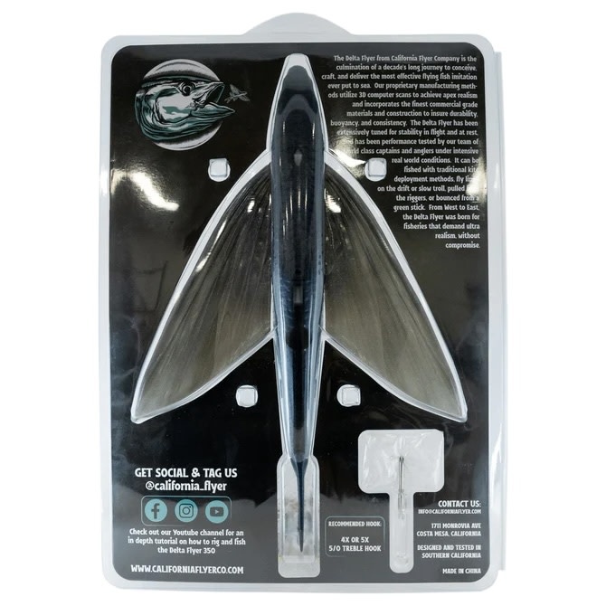 The Delta Flyer from California Flyer Company is the culmination of a decade’s long journey to conceive, craft, and deliver the most effective flying fish imitation ever put to sea. Our proprietary manufacturing methods utilize 3D computer scans to achieve apex realism and incorporates the finest commercial grade materials and construction to insure durability, buoyancy, and consistency. The Delta Flyer has been extensively tuned for stability in flight and at rest, and has been performance tested by our team of world class captains and anglers under intensive real world conditions . It can be fished with traditional kite deployment methods, fly lined on the drift or slow troll, pulled from the riggers, or bounced from a green stick. From West to East, the Delta Flyer was born for fisheries that demand ultra realism, without compromise.